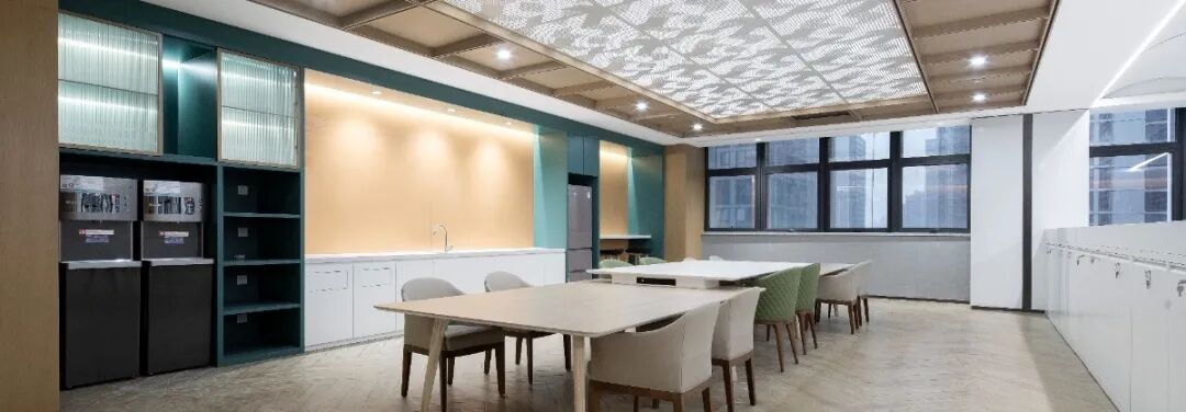 休息区、茶水间的整体视觉由大色块拼合而成,莫兰迪色系墙面过渡自然,呈现大气而纯粹的精致美感;地面木纹砖则采用人字型铺贴,错落有致的排列让木地板更加灵巧生动,使空间更富延展性。