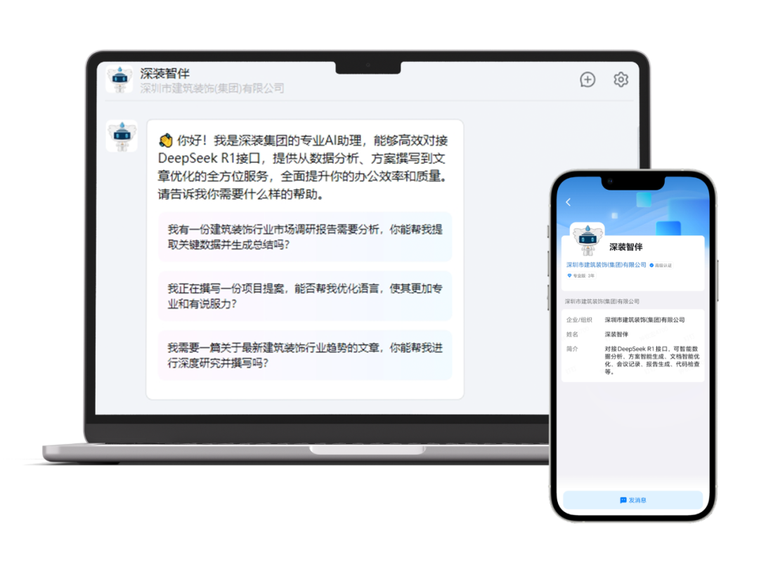 近日,kaiyun体育官网登陆正式于办公平台部署基于DeepSeek R1大模型的AI智能助理——深装智伴,在数字化转型与智能化办公领域迈出关键一步,以技术赋能企业高效协同,打造建筑装饰行业的智慧办公标杆。